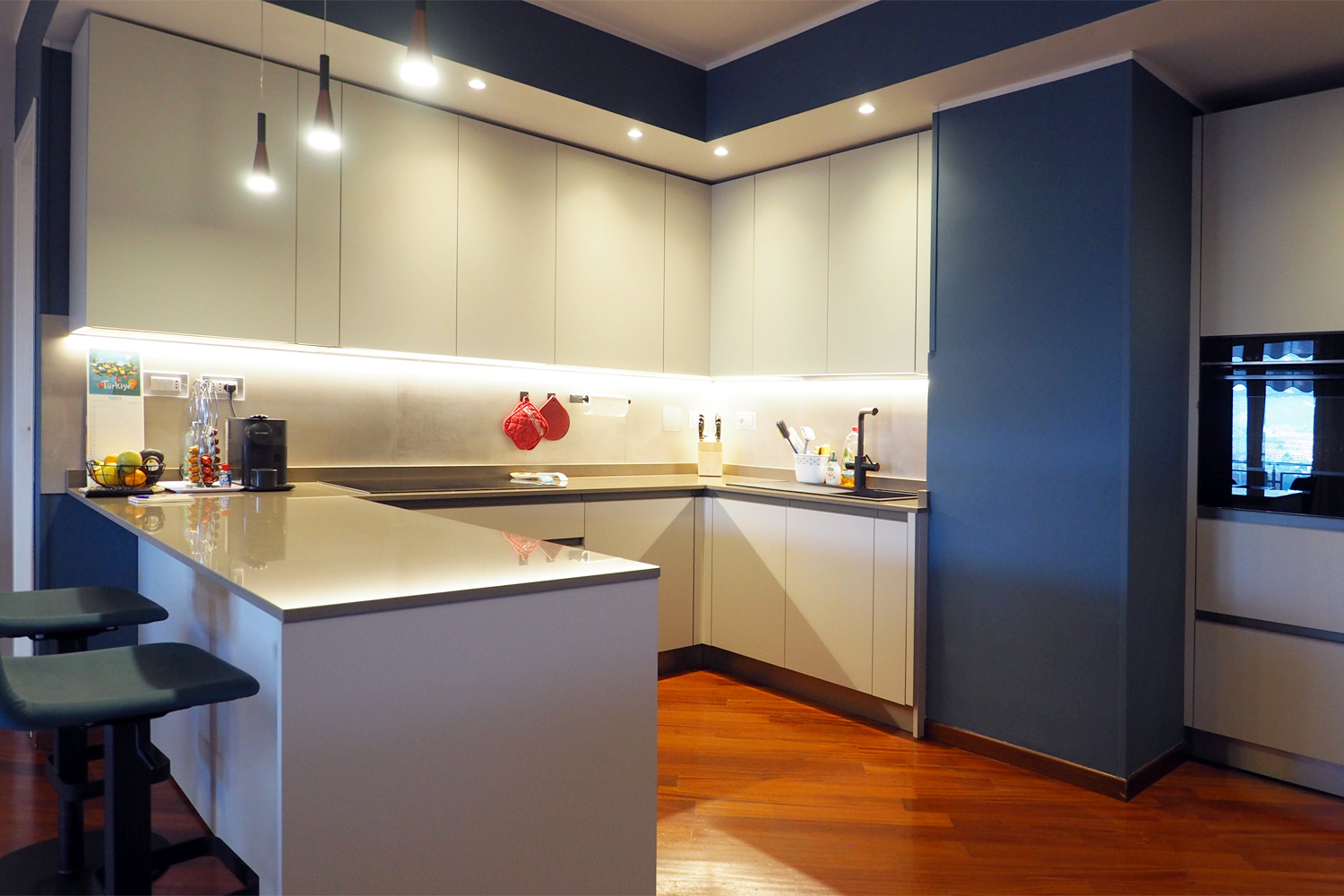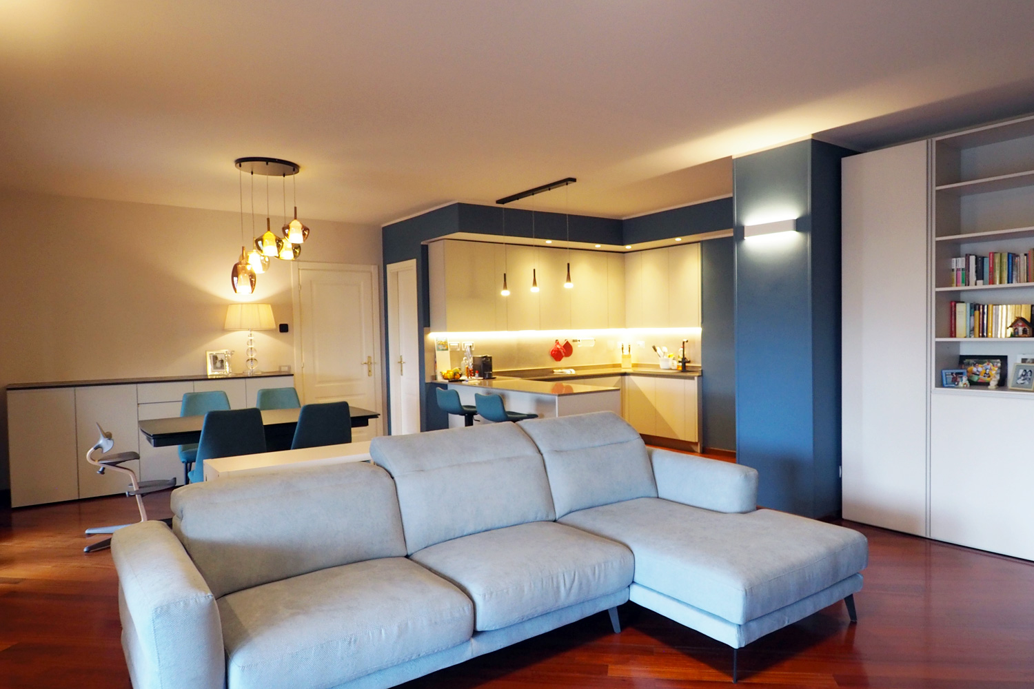 La sceltà è stata di rendere protagonista un colore deciso come l’ottanio, affiancandolo ad arredi chiari che giocano da contrappunto.