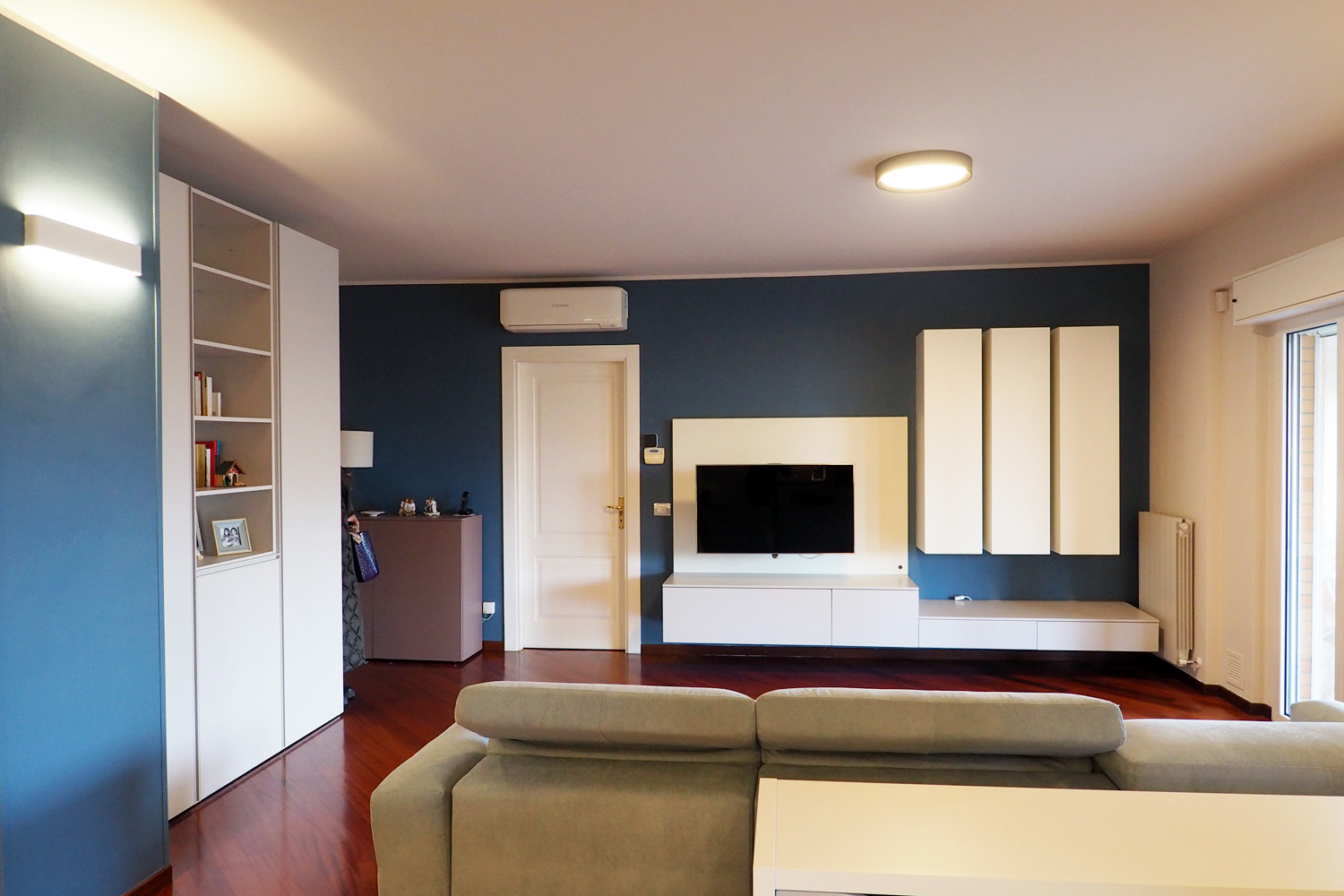La parete tv presente in soggiorno è stata interamente recuperata e rissemblata. L’effetto d’insieme è però completamente nuovo, grazie al colore della parete, che contribuisce ad una percezione diversa dello spazio.