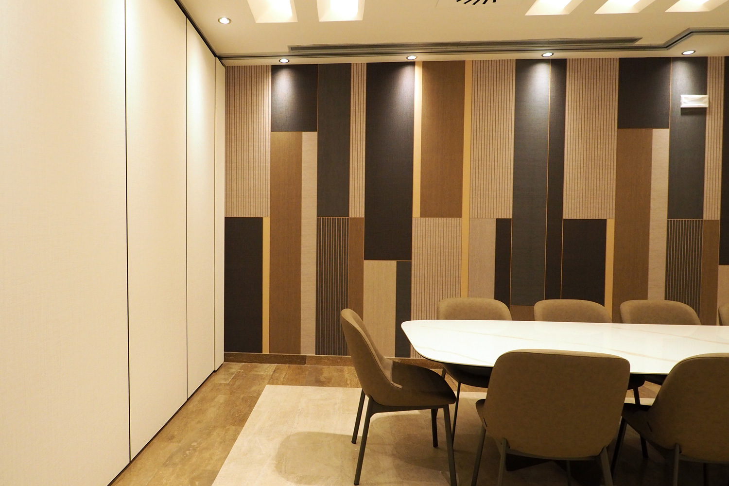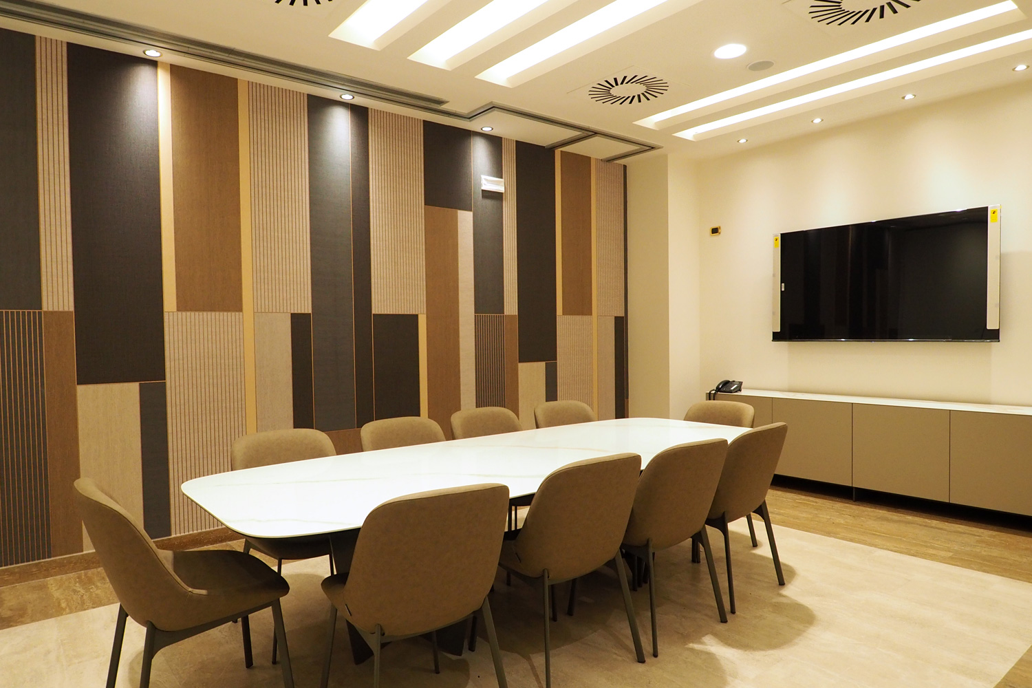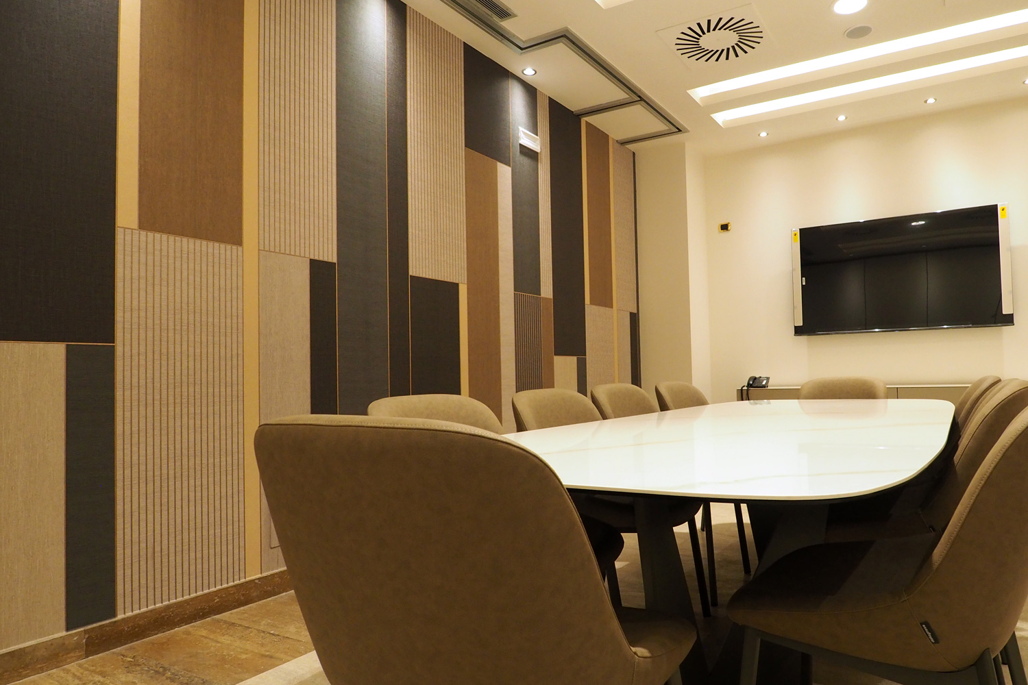 L’attigua sala riunioni Golden è caratterizzata dalla predominanza di un tavolo di grande eleganza e poltrone confortevoli. Le pareti sono rivestite con delle pannellature funzionli e una carta da parati che lascia vibrare le tinte della stanza generando un intimo senso di accoglienza.