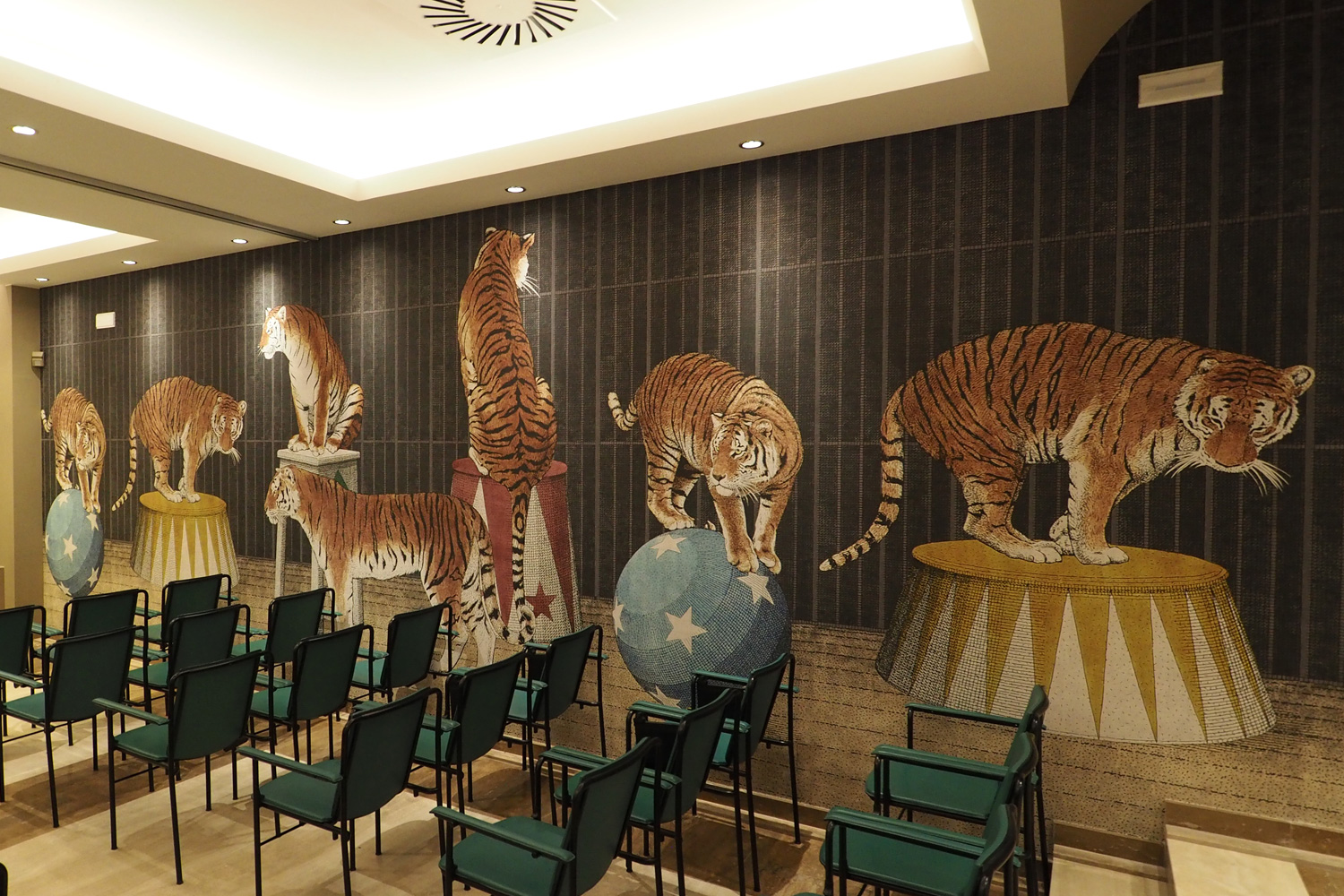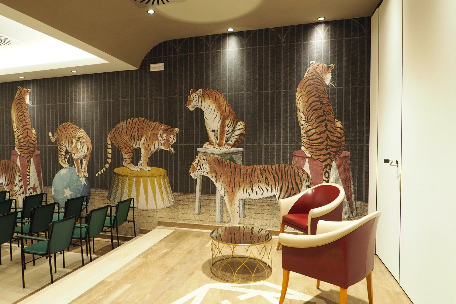 La sala meeting Le Tigri è uno spazio accogliente e creativo che può ospitare un contenuto numero di persone. L’inserimento di una decorazione muraria con le tigri trasmette forza e vigore, ma anche giocosità, come in un Circo.
